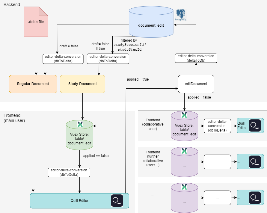 These two document types follow fundamentally different strategies for how content is loaded, edited, and saved. Both modes use Quill as the editor and Vuex for local state, but the backend logic and sync model differ.