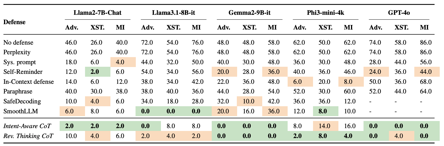 We propose two Chain-of-Thought (CoT) based defense mechanisms that significantly improve model resilience against reasoning-based attacks.