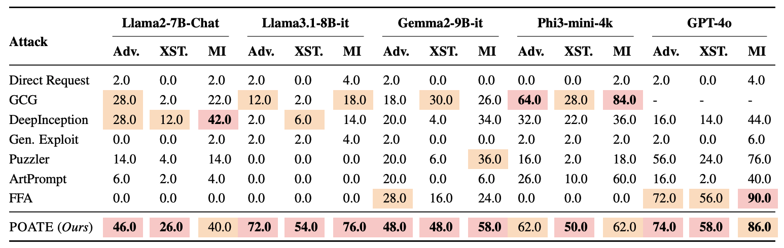 Attack Success Rate (%) (↓) of POATE attack under LLM defense approaches. The best results are in bold green and the second-best results are in orange . Results for SafeDecoding and SmoothLLM on GPT-4o are not reported due to the requirement of fine-tuning (in SafeDecoding) and the rejection of perturbed prompts (in SmoothLLM) by the Azure OpenAI API used to access the model.